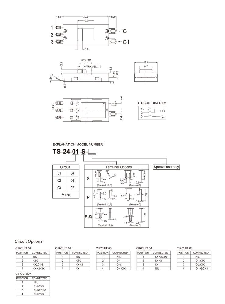 工作温度范围Operating temperature range:-30℃ to+85℃ 额定电流Rating:3A 250V AC 绝缘电阻Insulation resistance: 100MΩ min.500V DC 接触电阻Contact resistance: 30m Ω max. 操作力度Operating fore:250±100gf 寿命Life time:10000 cycles(依产品而定)