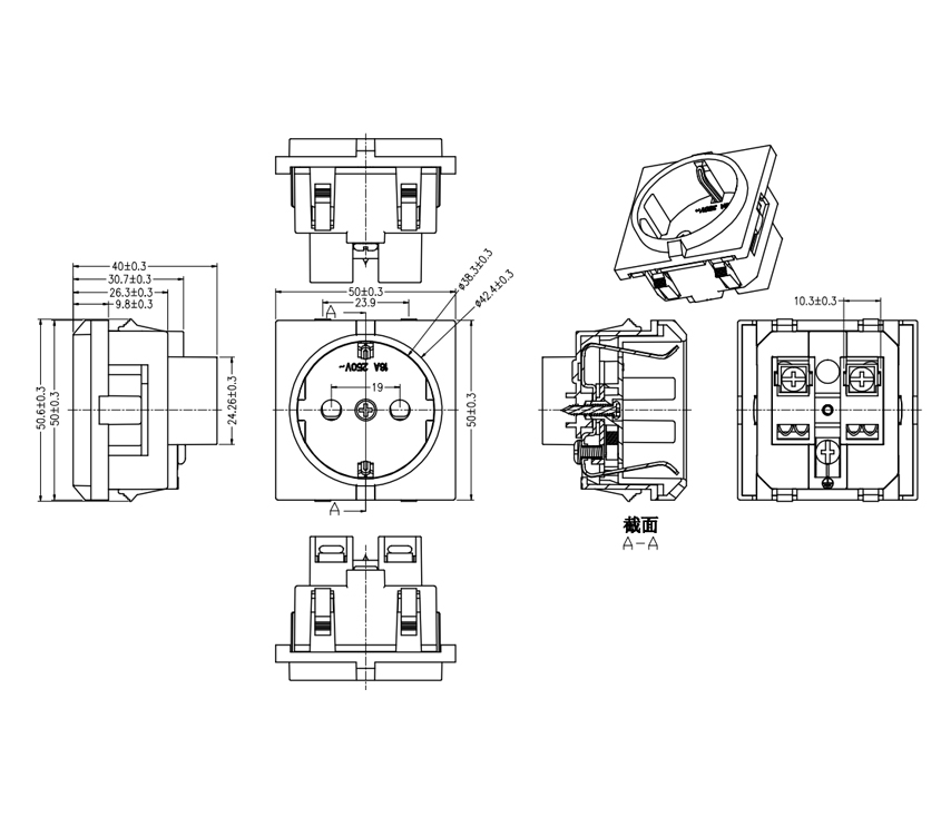 额定值:16A 250V AC 绝缘电阻:100MΩ500V DC / 1分钟 介电强度:2000V AC / 1分钟 外壳材料:热塑性塑料94V-2〜V-0 Pancel切出:45X45毫米